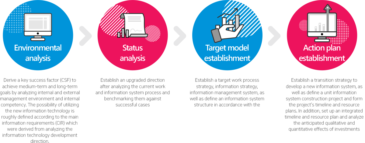 | Main procedures | · Management environment analysis, internal environment analysis, information vision and goal establishment, investment planning and budget planning, information strategy development, information structure design | · Establishment of construction scope and direction, required technology details, implementation plans, budget allocation, company selection criteria, evaluation support, investment and budget plans · Define functional and technical requirements |