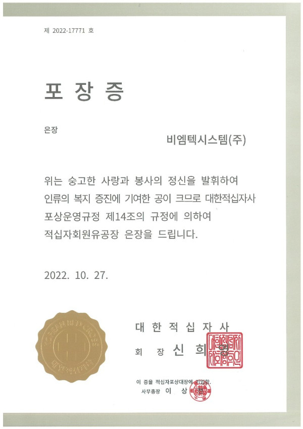 2022년 비엠텍시스템(주) 대한적십자사 회원 유공장 포장증 은장을 수상하였습니다.