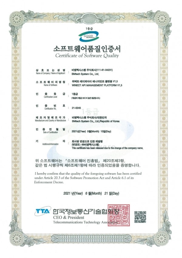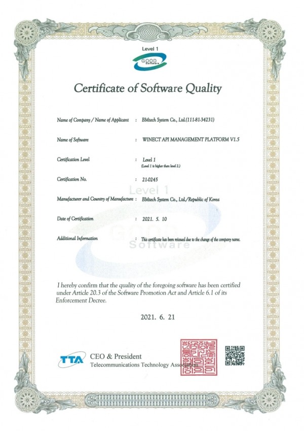 GS인증(1등급) 소프트웨어 품질인증서 취득하였습니다.