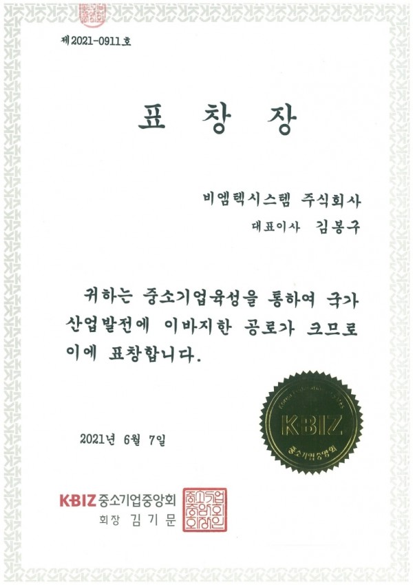 2021 서울 중소기업인 대회 중소기업중앙회장표창 수상