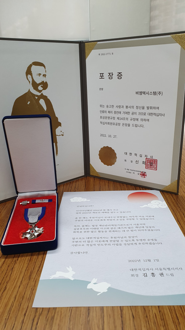 2022년 비엠텍시스템(주) 대한적십자사 회원 유공장 포장증 은장을 수상하였습니다.