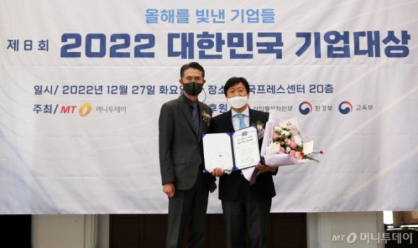 김봉구 비엠텍시스템 대표(사진 오른쪽)가 27일 오후 서울 중구 한국프레스센터에서 열린 머니투데이 주최의 '2022 제8회 대한민국 기업대상' 시상식에서